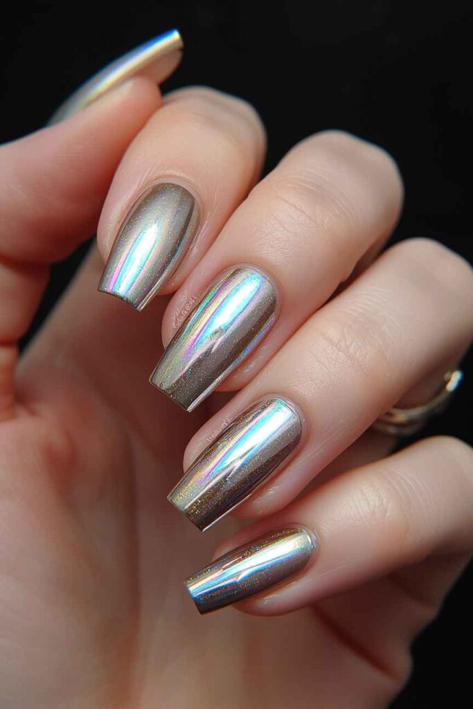 Holographic metallic shades reflect light beautifully, changing colors as you move. Combine with matte or dark tones for a striking contrast. This playful yet bold look captures the autumn vibe in a futuristic way.