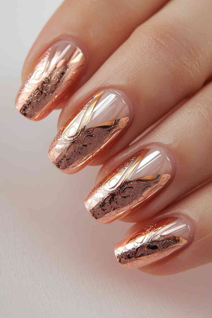 Rose-gold metallic accents soften bold designs with a subtle shimmer. Apply on tips, cuticles, or as abstract shapes to create a trendy fall look. Its warm tone pairs beautifully with browns, purples, and muted greens.