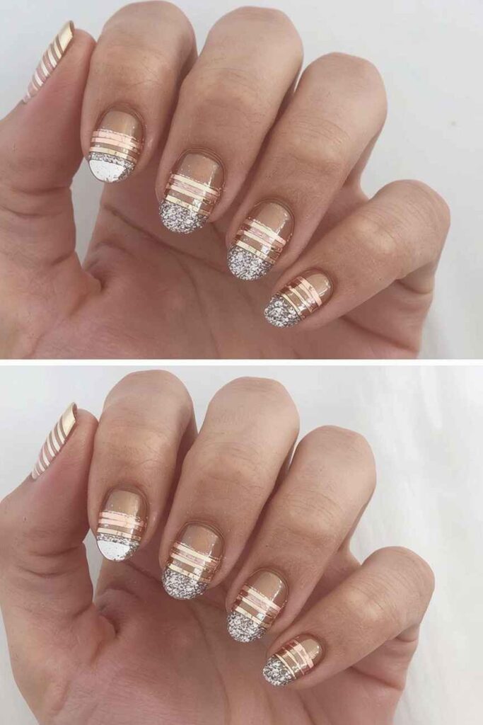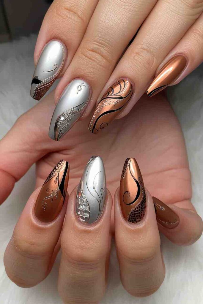 Mixing silver and bronze creates a chic, industrial vibe. Alternate metals on different nails or use them in geometric patterns for a modern, edgy look. This combination works well on dark or muted fall shades, making your nails both bold and stylish.