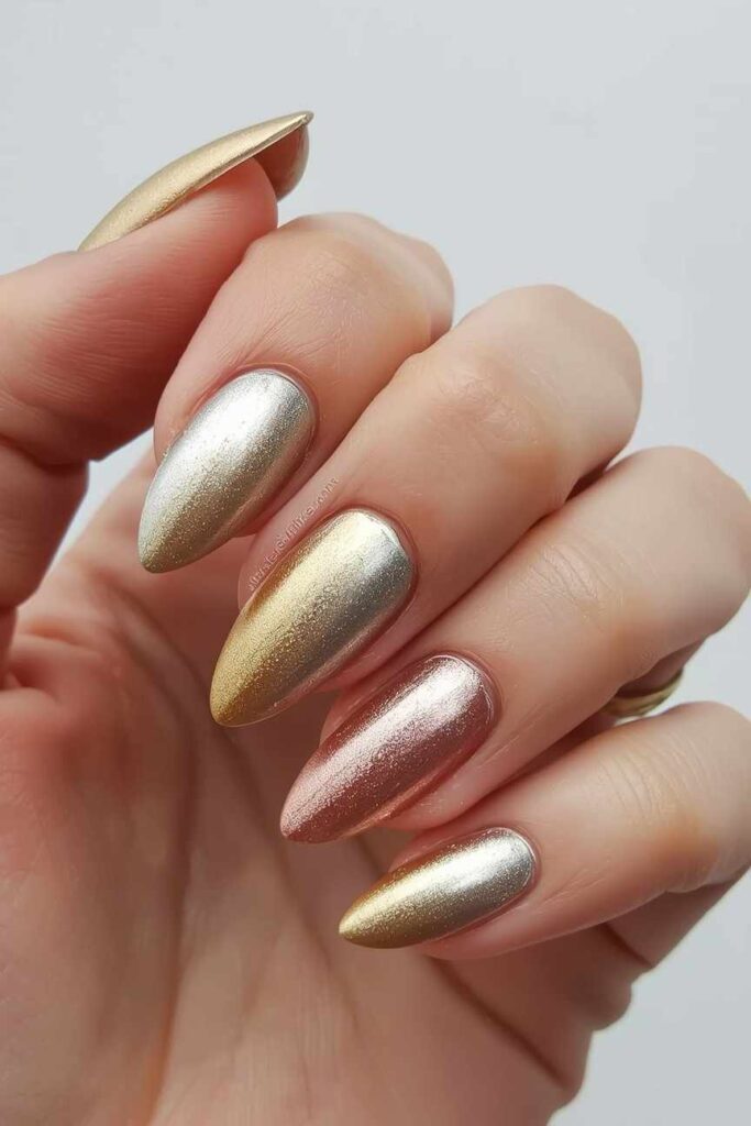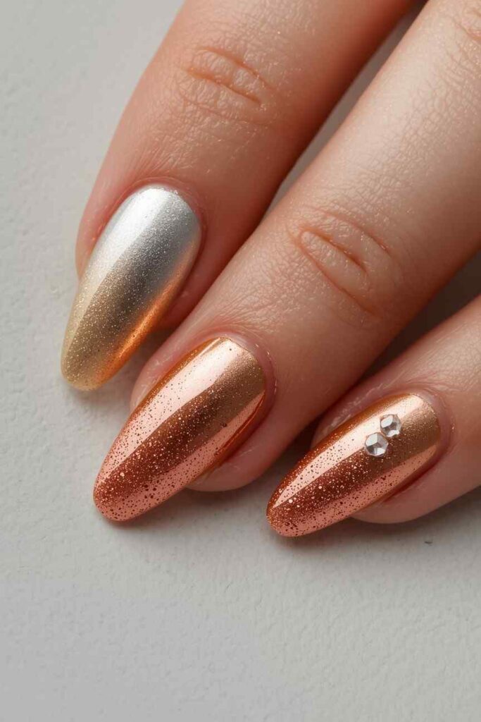 Ombre nails with varying metallic shades blend seamlessly from gold to bronze or silver. This style creates a striking gradient effect, making nails visually dynamic and perfect for bold autumn looks.