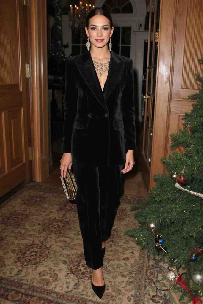 A black velvet suit is the perfect blend of power and glamour. It’s luxurious without being flashy, making it ideal for upscale Christmas dinners.