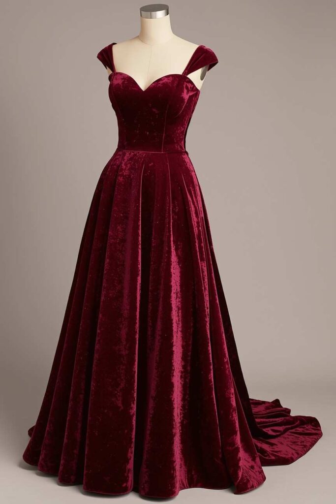 For the ultimate glam moment, a burgundy velvet gown delivers timeless luxury. The rich color and plush fabric create an instantly elegant Christmas look.