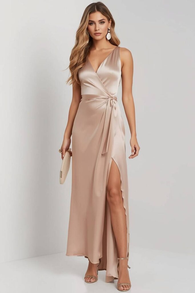 Choose a fitted, flowing, or slit design depending on the event’s formality. Style with gold accessories, strappy heels, and a metallic clutch.