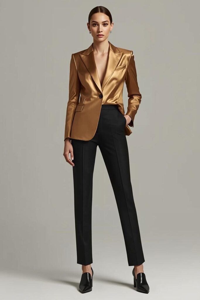 10. Gold Satin Blazer with Black Tailored Pants