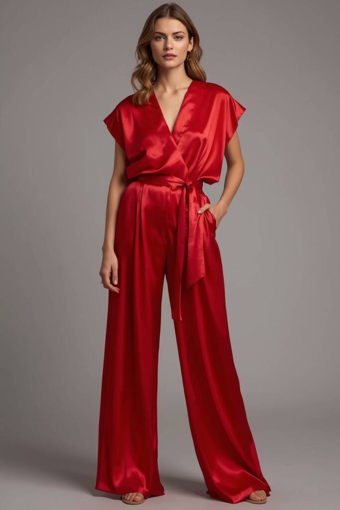 A red satin blouse adds instant festive flair, while wide-leg pants keep the look polished and comfortable. Choose black, white, or sequinned pants depending on how glam you want to go.
