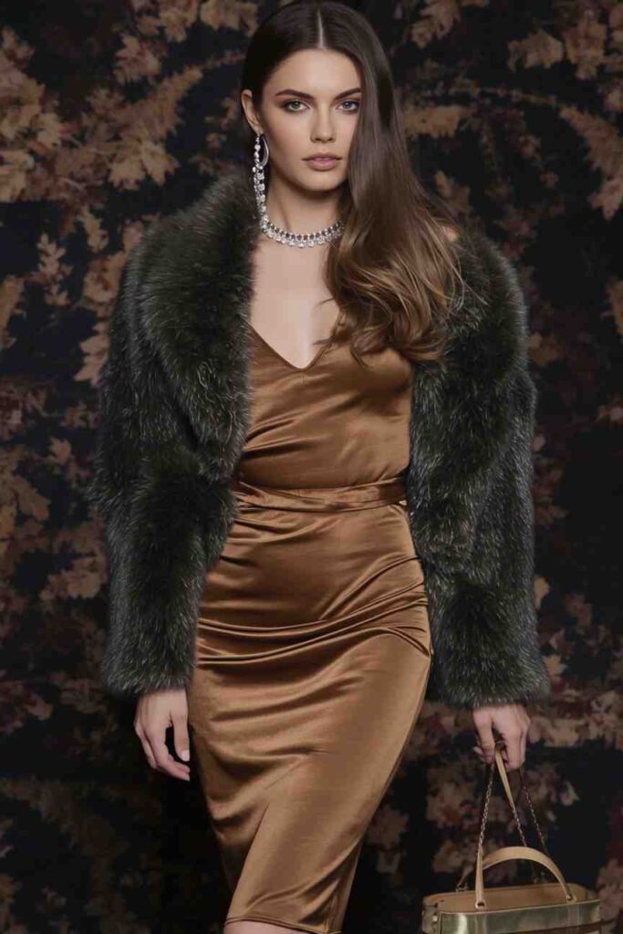 2. Satin Slip Dress with Faux Fur Shawl