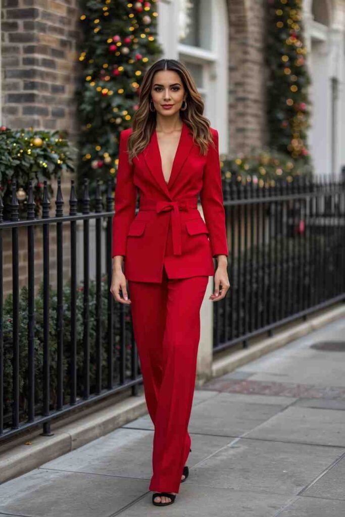 It’s bold yet refined, making it suitable for elegant Christmas dinners or corporate holiday events. Style with straight hair or a sleek ponytail to maintain the outfit’s classy, streamlined aesthetic.