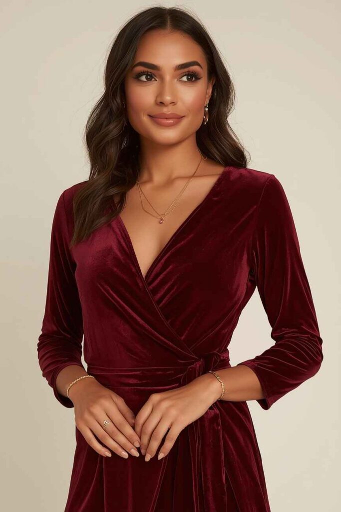 A velvet wrap dress exudes effortless Christmas elegance, offering comfort and refinement in one stunning piece. Velvet’s rich texture makes it perfect for holiday dinners, while the wrap silhouette flatters every body type.