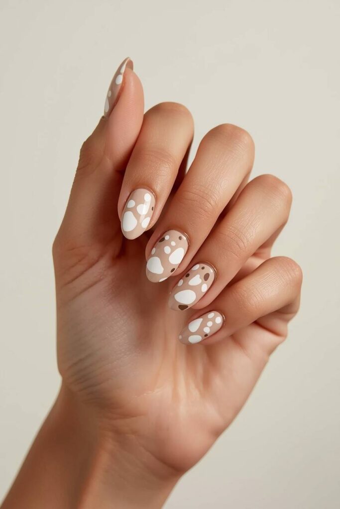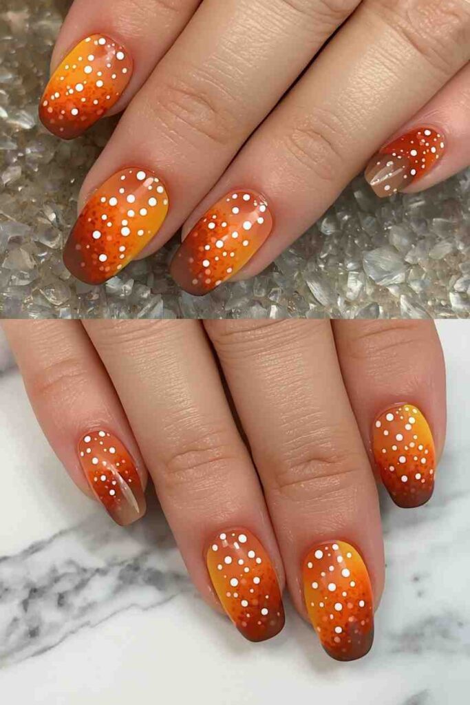 Create an ombre effect with shades of brown, orange, and cream, and add small dots along the tip or cuticle. This design mimics fall foliage colors and adds visual interest to your manicure.