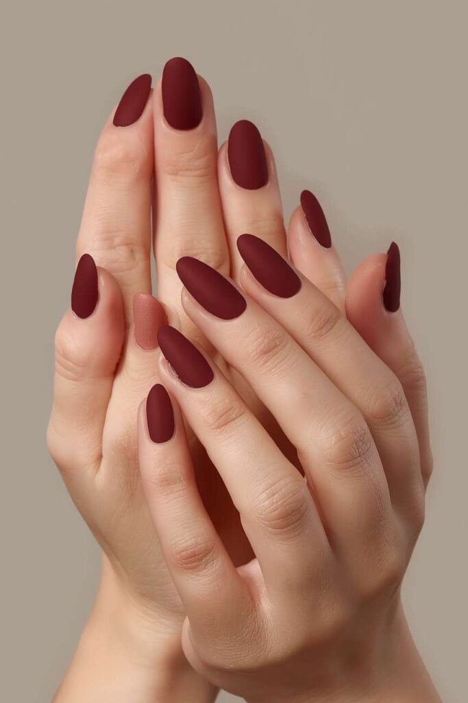 Deep, matte red nails embody autumn warmth. Accent one or two nails with tiny dots or subtle patterns to add dimension. This classic fall color pairs beautifully with sweaters, scarves, and seasonal jewelry for a polished, cozy look.