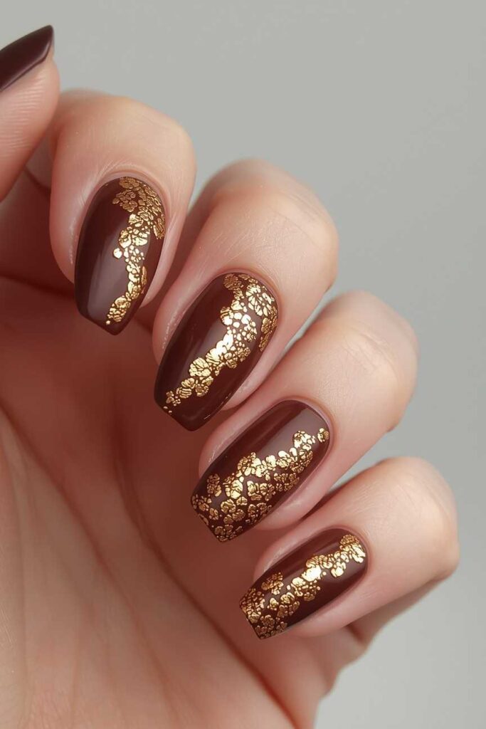 A deep chocolate brown base paired with gold foil accents creates a luxurious fall vibe. Apply foil sparingly on one or two nails for subtle shimmer. This combination works beautifully for evening events or festive occasions while keeping the overall manicure classy and autumn-ready.