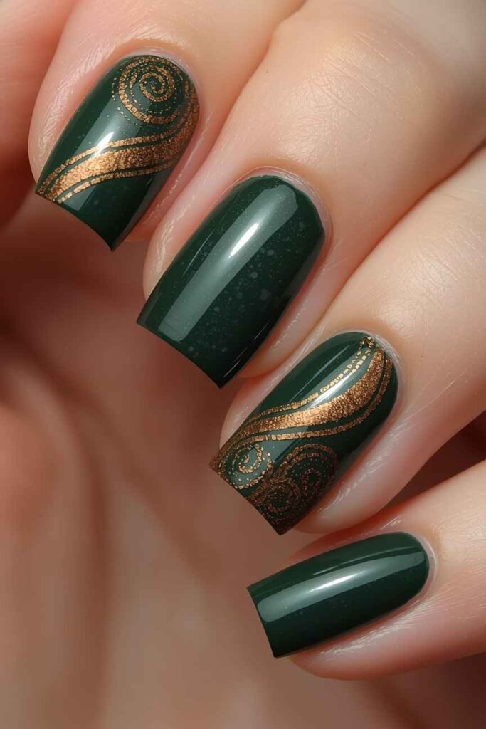 Pair deep forest green nails with chocolate brown tips or dots for a rich fall palette. This combination offers sophistication and warmth, perfect for those who want earthy tones with subtle variety.