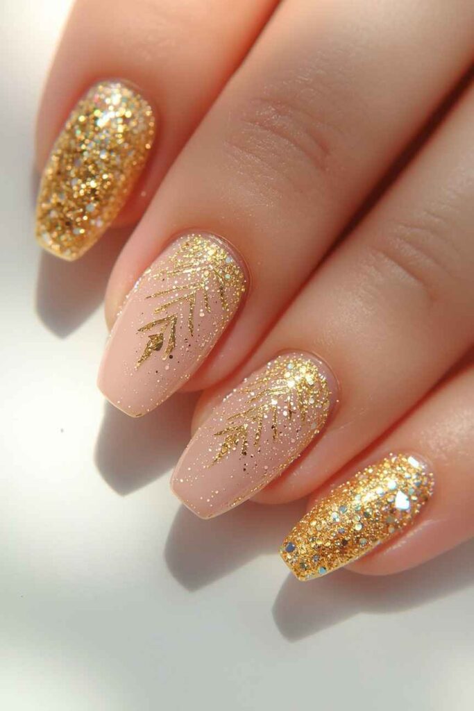 Add tiny golden glitter dots or accents on neutral or brown nails to bring subtle sparkle. This design is perfect for parties or evenings out, offering festive vibes without overwhelming your manicure. Glitter enhances any autumn nail palette and complements cozy outfits.
