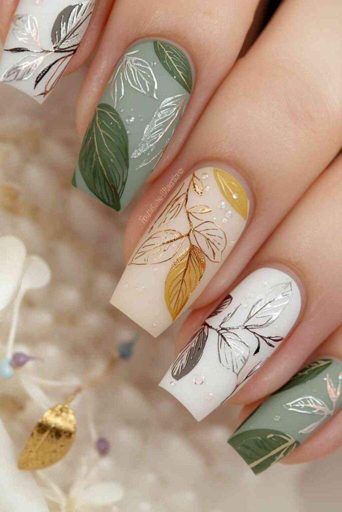 Bring the essence of fall to your nails with leaf motifs. Use warm tones like rust, mustard, and olive green on a neutral base. Paint tiny leaves or abstract foliage on one or two accent nails for seasonal charm. This design is perfect for nature lovers and adds an elegant touch to your manicure while keeping it subtle and wearable.