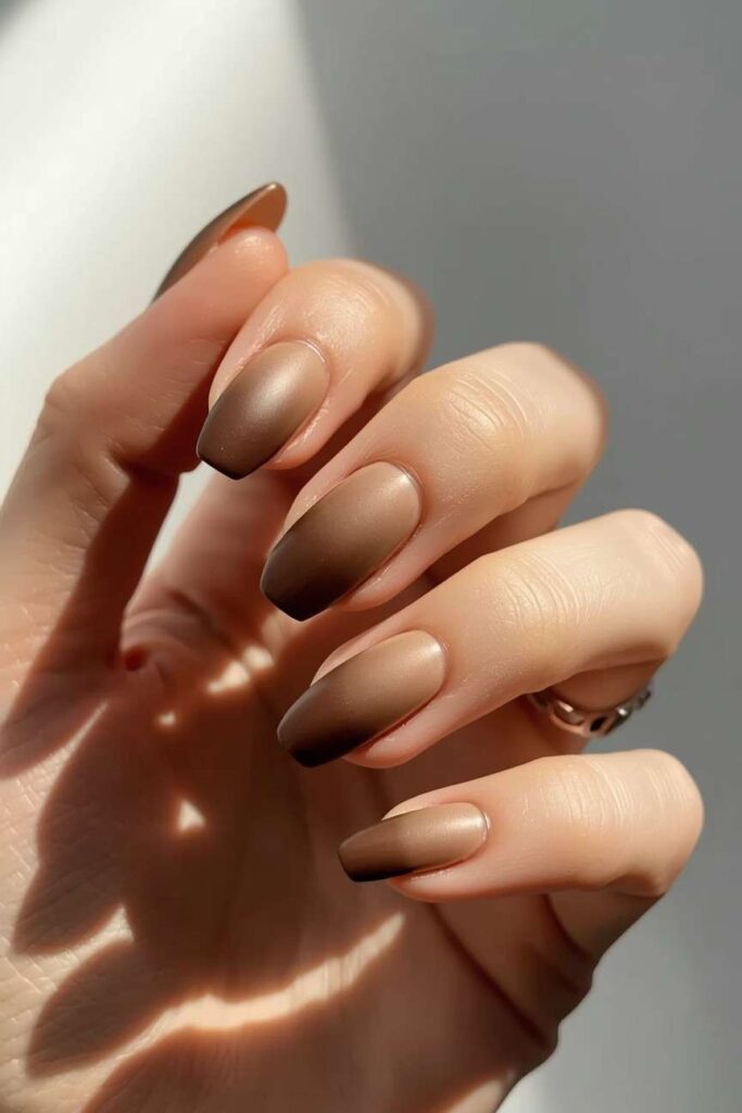 Ombre designs are timeless, and in fall, matte brown gradients offer a cozy yet stylish touch. Blend shades of beige, chocolate, and caramel across each nail for a natural fall look. Matte finishes add sophistication, while subtle shimmer dots can provide gentle sparkle. This style works well for short or long nails and pairs effortlessly with seasonal fashion and accessories.