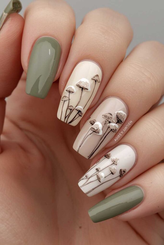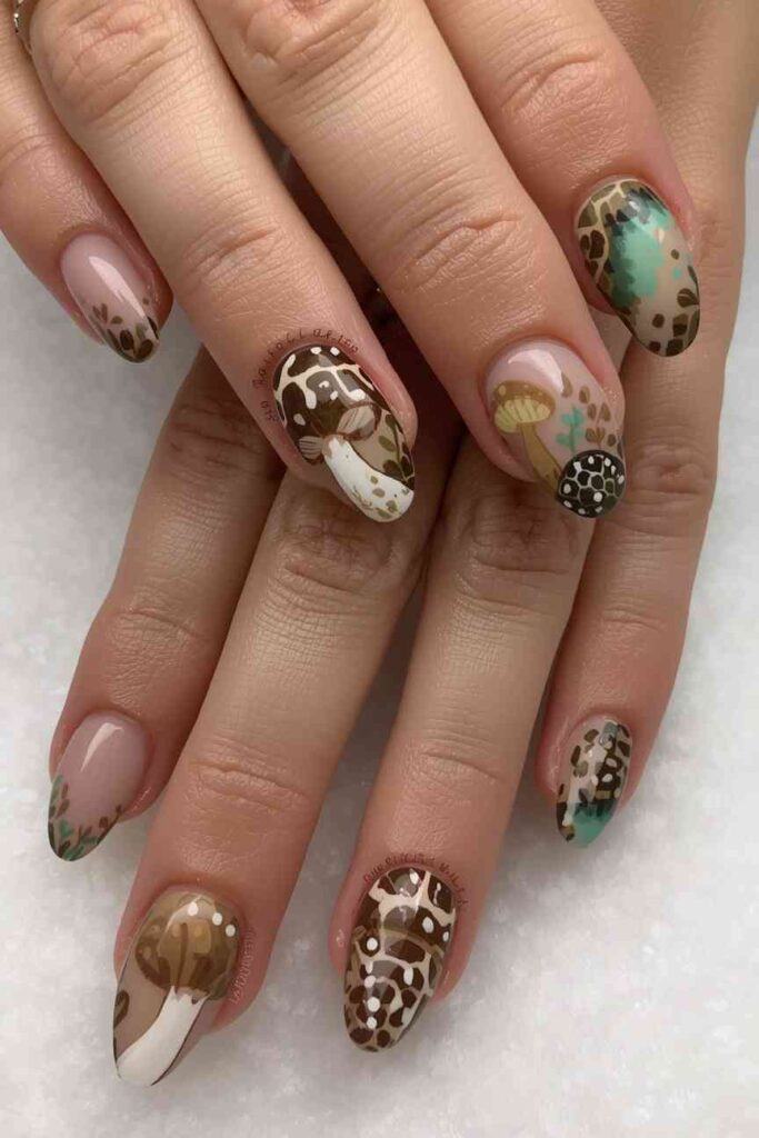Combine mushroom and tortoise shell designs across different nails for a playful yet sophisticated fall manicure. Keep colors earthy and neutral for cohesion. This mix allows creativity while maintaining elegance, making it perfect for fashion-forward nail enthusiasts looking for a unique seasonal style.