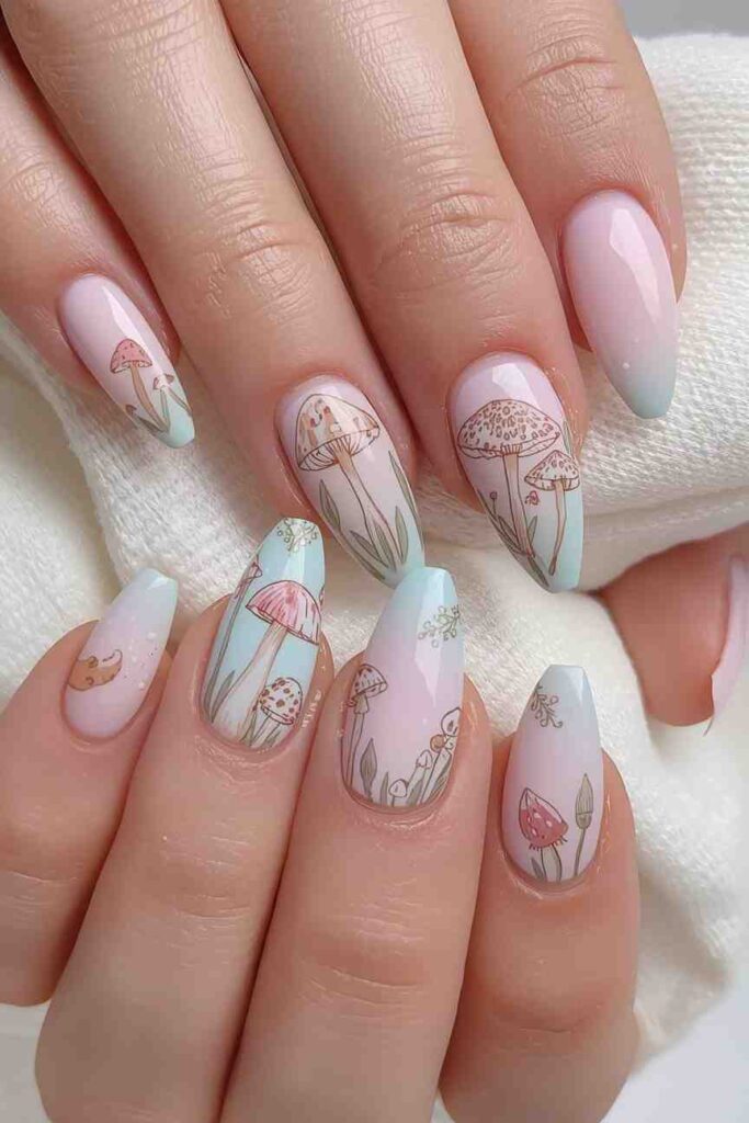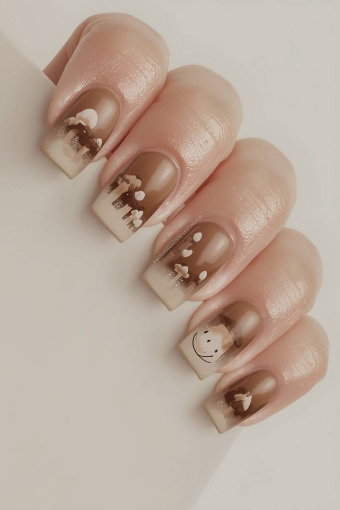 Blend soft brown and beige tones in a gradient style, adding tiny mushroom motifs at the base or tip. This whimsical approach enhances depth while keeping nails seasonal and stylish.