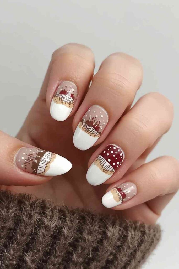 Combine various autumn designs like mushrooms, tortoise shell, dots, and stripes on different nails. Keep the base neutral for cohesion. This mix-and-match style is playful, creative, and perfect for autumn nail enthusiasts who love variety.