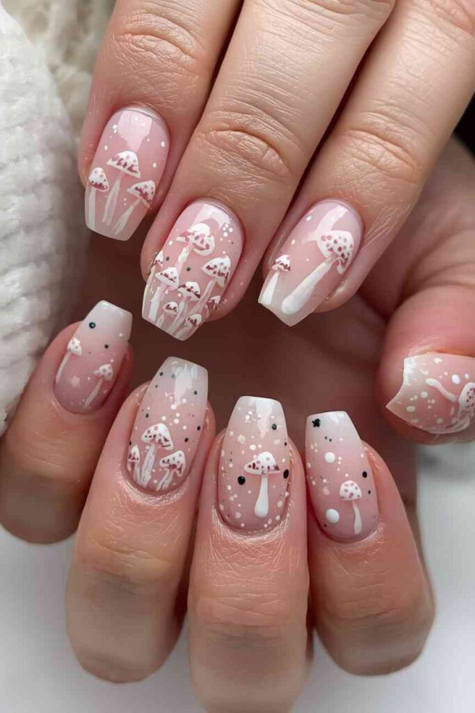 Paint tiny clusters of mushrooms on one or two nails, leaving others nude. This style adds whimsy without overwhelming, perfect for nature-inspired autumn nail art.