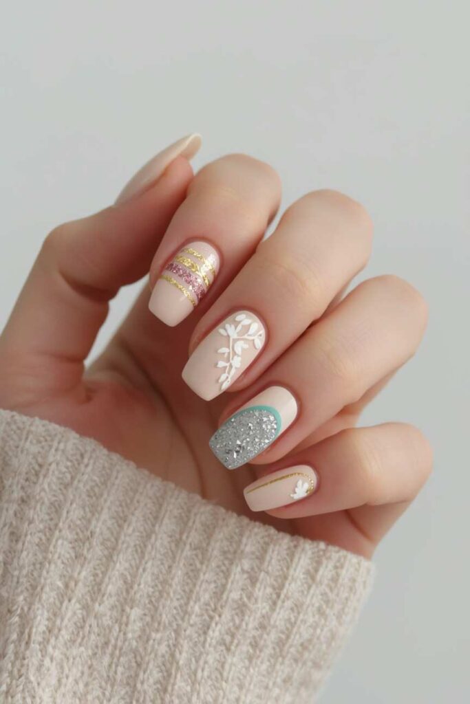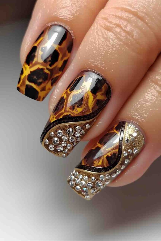 Combine tortoise shell accent nails with subtle golden glitter on other nails. This fusion creates a chic, festive vibe while keeping the overall design cohesive and elegant.