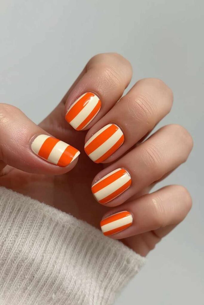 Create a bold yet seasonal statement with alternating orange and cream stripes on accent nails. Pair with nude or brown bases for balance. This playful design captures autumn energy while remaining wearable for everyday looks.