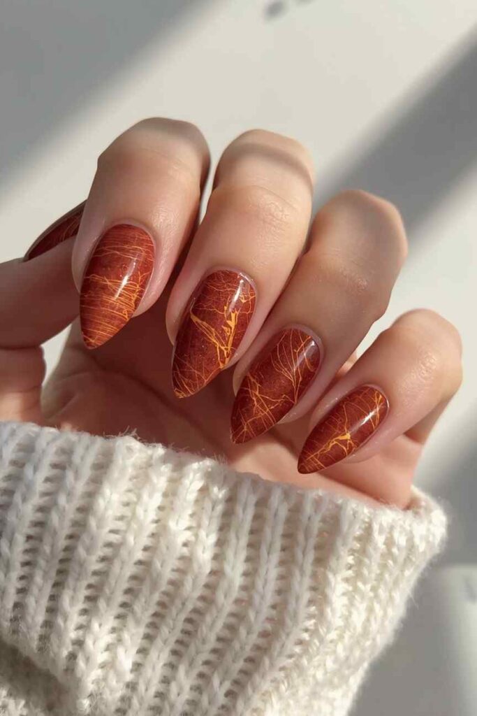 Marble nails are elegant, and rust-colored swirls perfectly capture autumn warmth. Blend shades like burnt orange, brick red, and brown to create a flowing, natural pattern. Marble nails add sophistication and visual interest without being overwhelming, making them perfect for statement fall manicures.