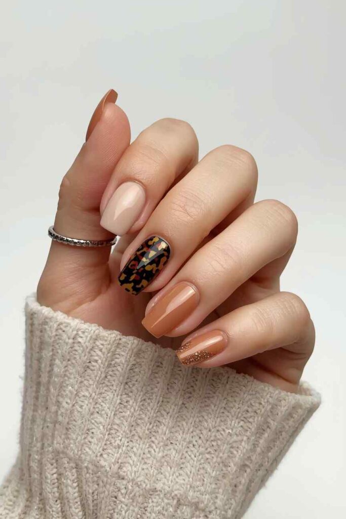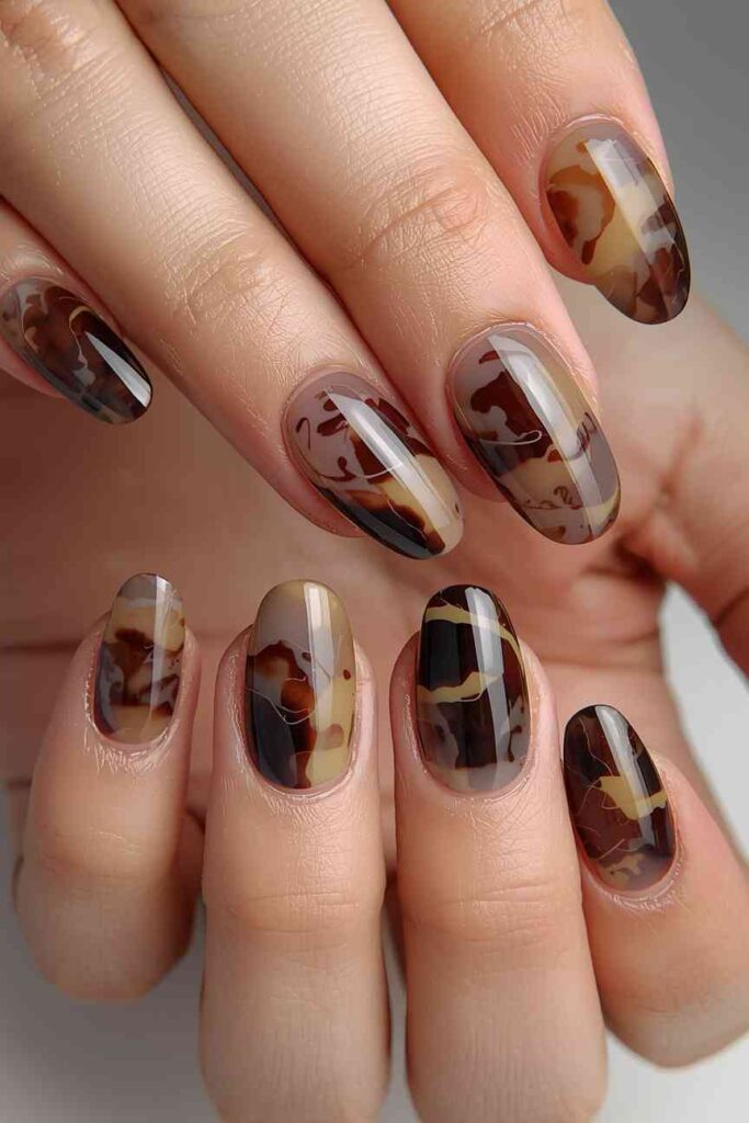 Tortoise shell nails create a chic, sophisticated look for fall. Use brown, amber, and caramel shades to mimic the natural pattern on one or two nails, keeping the rest neutral. This design pairs beautifully with glossy finishes to enhance the depth of the shell effect. Tortoise shell nails are perfect for office wear, brunch dates, or casual outings, adding elegance without appearing overly flashy.